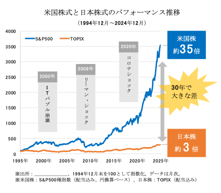 1994年から2024年までの30年間の米国株(S&P500種指数)の市場パフォーマンスは約35倍。期間中大きな下落もありましたが、日本株(TOPIX)と比較して上昇基調での推移を続けています。長期的・継続的に成長を続ける米国株式への投資は、大きなリターンが狙えるでしょう。