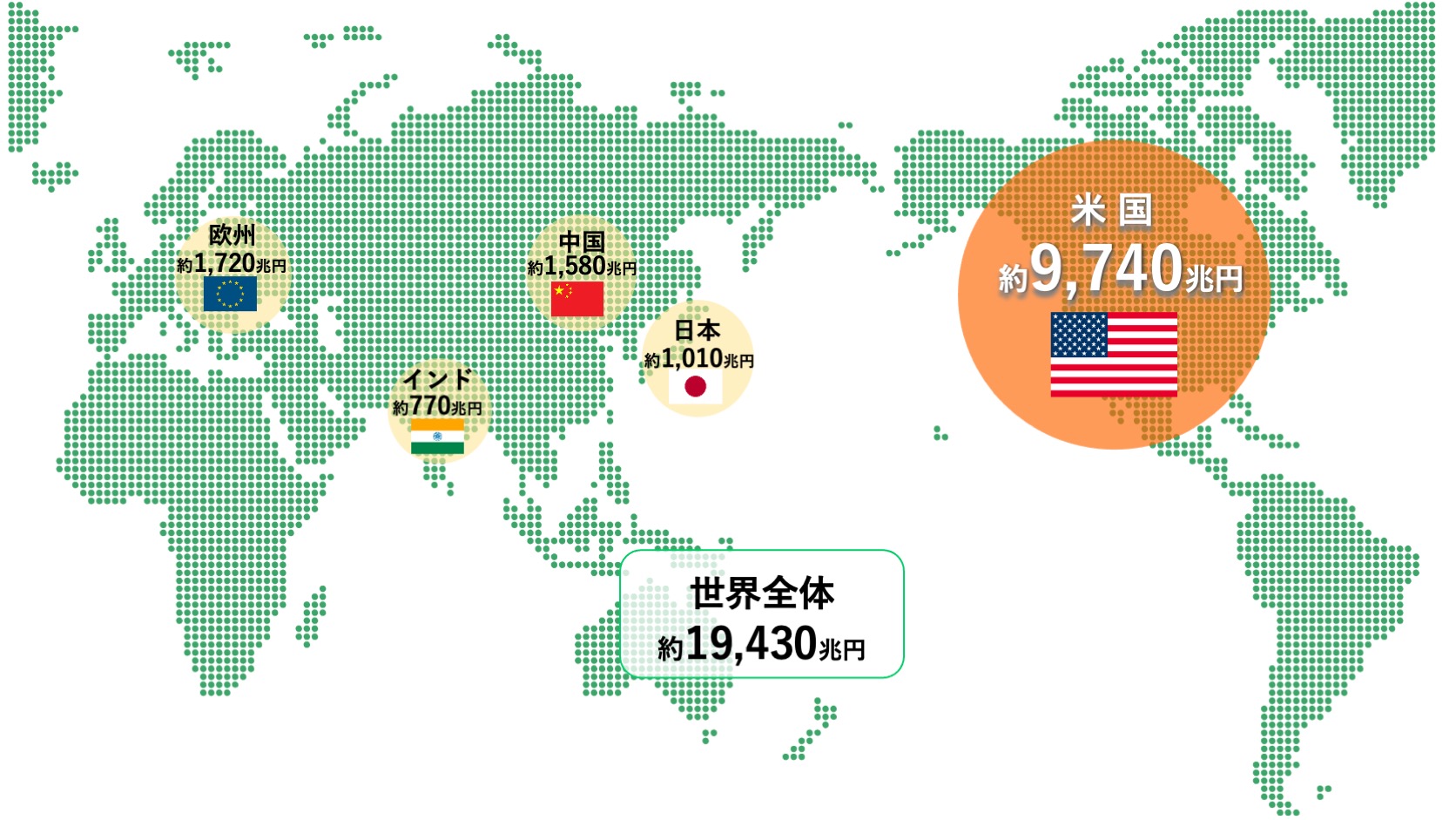 米国企業の時価総額は約9,740兆円(2024年末時点)。世界の半分近くを占めており、世界最大です。