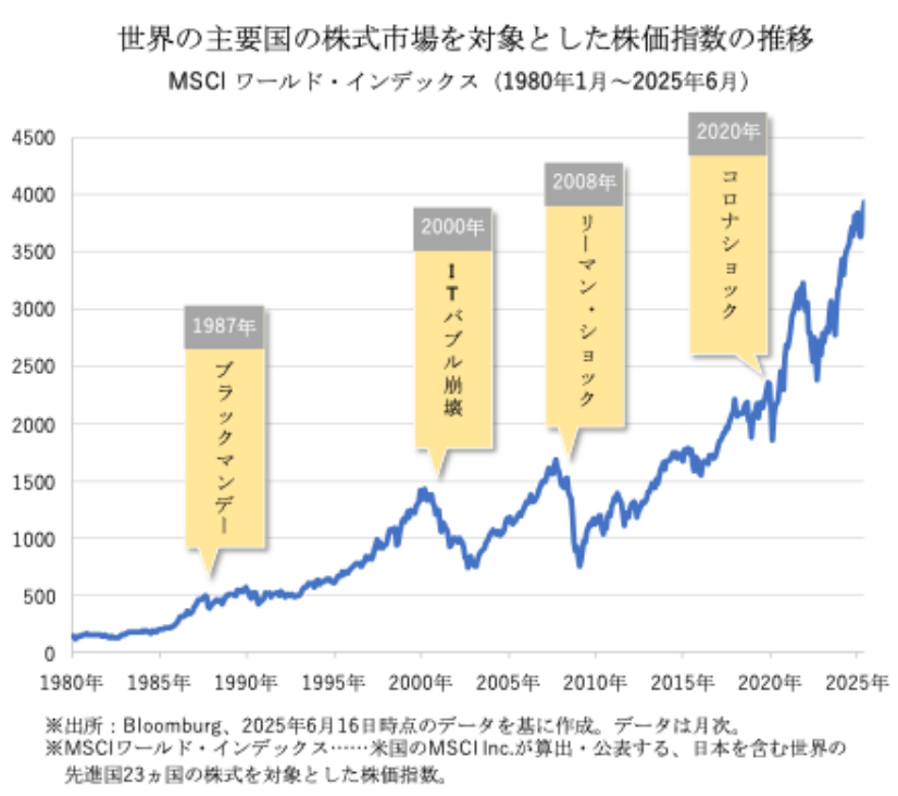 過去、世界ではさまざまな場面で金融危機・経済危機がありましたが、長期で見るとその後は世界経済の成長に伴って回復し、上昇してきた傾向がわかります。