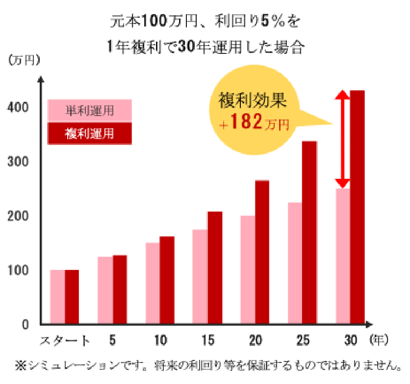 「複利」とは、「元本だけでなく、利子にも利子がつく状態」で、運用から得た利益を再投資することで、利益が利益を生んで資産をふやすことができます。例えば、「分配金再投資」の投資信託なら、長期投資との相乗効果で複利効果が期待できます。