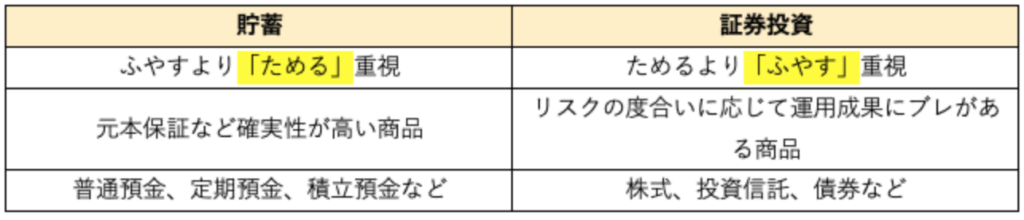投資とは、資産をふやすことを目的に、株式や債券、投資信託などの金融資産に資産を投じることです。貯蓄はお金を「ためる」ことに重点をおきますが、投資はお金を「ふやす」ことに重点をおいています。