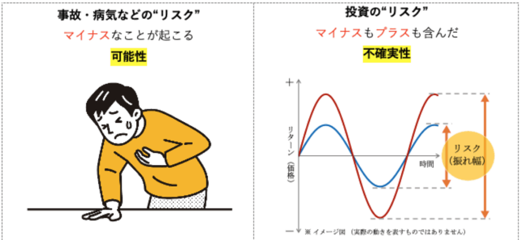 一般的に「リスク」という言葉は、「事故・病気のリスク」といったマイナスなことが起こる可能性、「危険」という意味で使われますが、投資においては「リスク=危険」ということではありません。