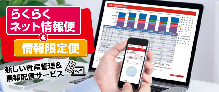 「らくらくネット情報便」とは、PCやスマートフォン等から、お預り資産情報や口座情報に加え、マーケットデータや市況解説などの投資情報を無料でご覧いただける資産管理&情報配信サービスです。