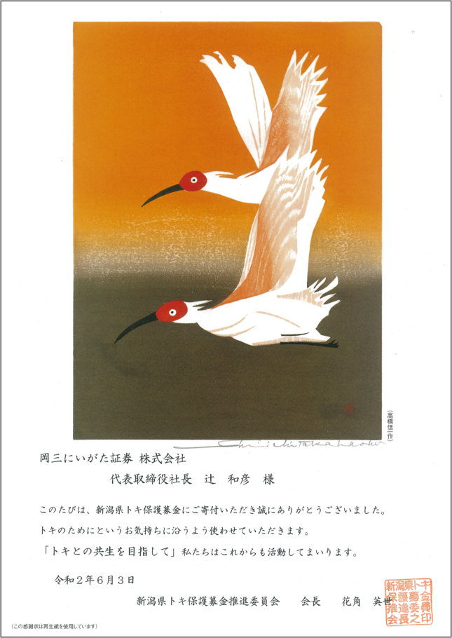 「先進国高格付ソブリンオープン(毎月決算型)(愛称:トキ応援ファンド)」および「円ヘッジソブリン/Jリートインカムオープン(毎月決算型)(愛称:トキ子育て応援ファンド)」を販売し、これら2商品から得られる信託報酬の一部を「新潟県トキ保護募金」に寄付してまいりました。