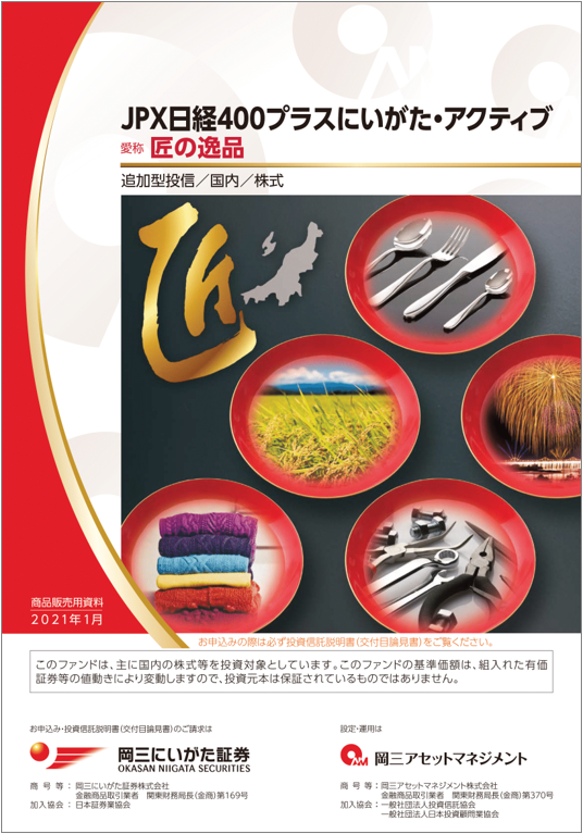 「JPX日経400プラスにいがた・アクティブ(愛称:匠の逸品)」 を販売し、運用資金の一部を、新潟県に本社や主力工場等をもつ企業の上場株式に投資することで、県内経済の発展に貢献する企業の未来を応援してまいりました。
